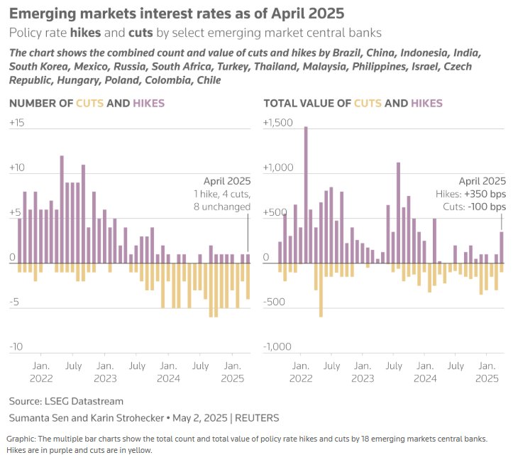 值得注意的是,土耳其在国内政治动荡后意外大幅加息350个基点以遏制资本外流。该国最新举措加上巴西年内两次加息,使2025年至今新兴市场的累计紧缩幅度达到550个基点。而其他新兴市场央行则通过14次降息累计实施850个基点的宽松政策。
